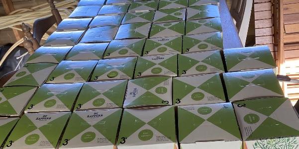 We hebben circa 350-360 kg appels en 25 kg peren geplukt. Daaruit zijn 73 pakken van 3 liter sap gekomen. In totaal 219 liter puur sap van onbespoten appels en peren